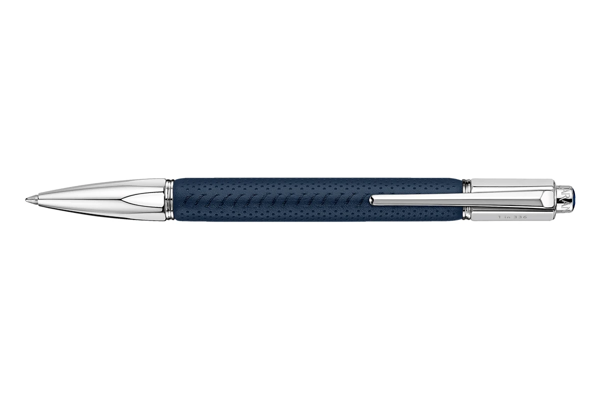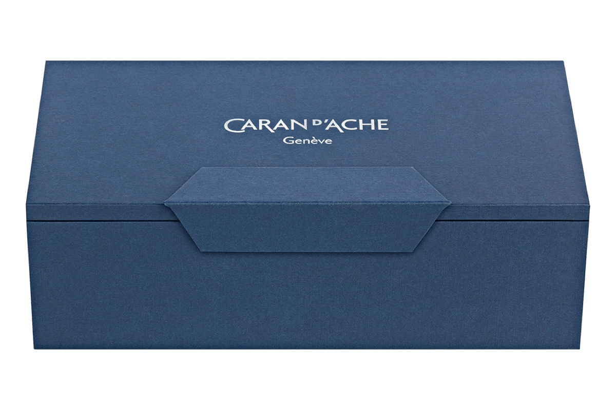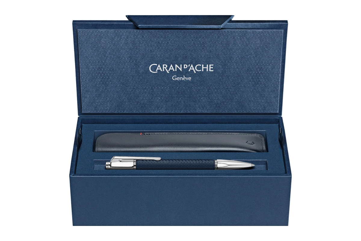 Deze pen heeft een messing lichaam bedekt met zorgvuldig gemaakt geperforeerd nachtblauw leer, versierd met een fijne handgestikte blauwe naad. Het leer is hoogwaardig Europees kalfsleer met minerale looiing uit Italië. De pen heeft een verzilverde gerhodineerde schroefdop met het Caran d’Ache logo gelaserd op de bovenkant.