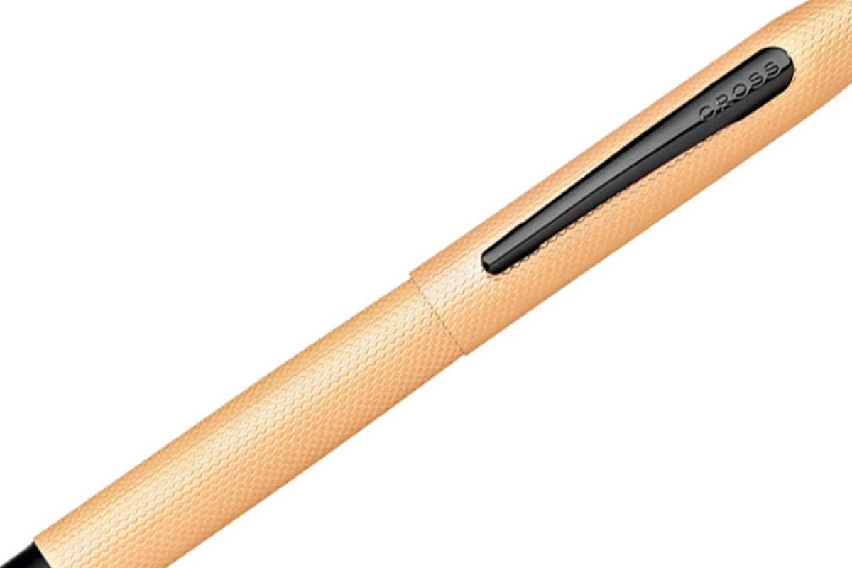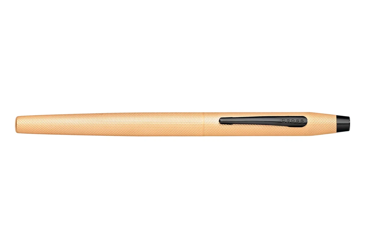 Klassieke Century vulpen in geborstelde rosé gouden PVD-afwerking met gepolijste zwarte PVD-rand en penpunt met de merkidentiteit van Cross.