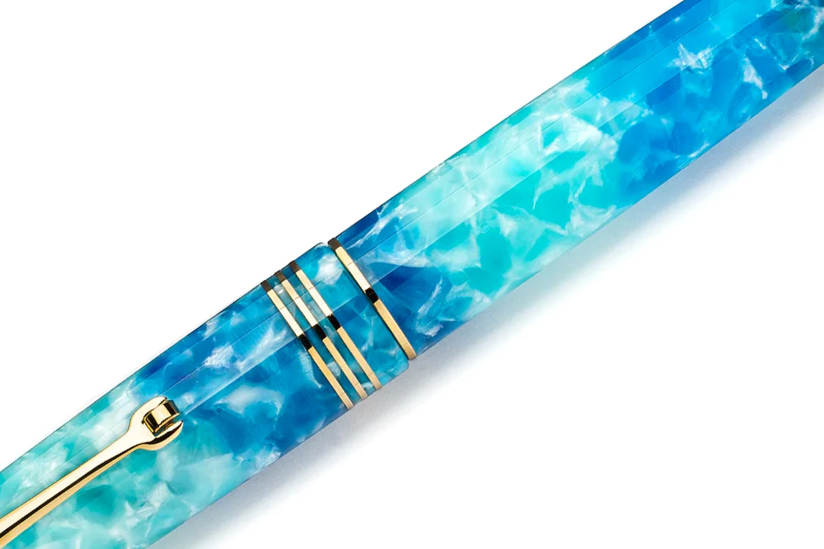 De vulpen heeft een adembenemende harsvulling met levendige kleuren. De sierlijke mix van licht- en donkerblauw creëert een boeiend visueel meesterwerk dat u meeneemt naar een wereld van rustige stranden en de blauwe zee.
