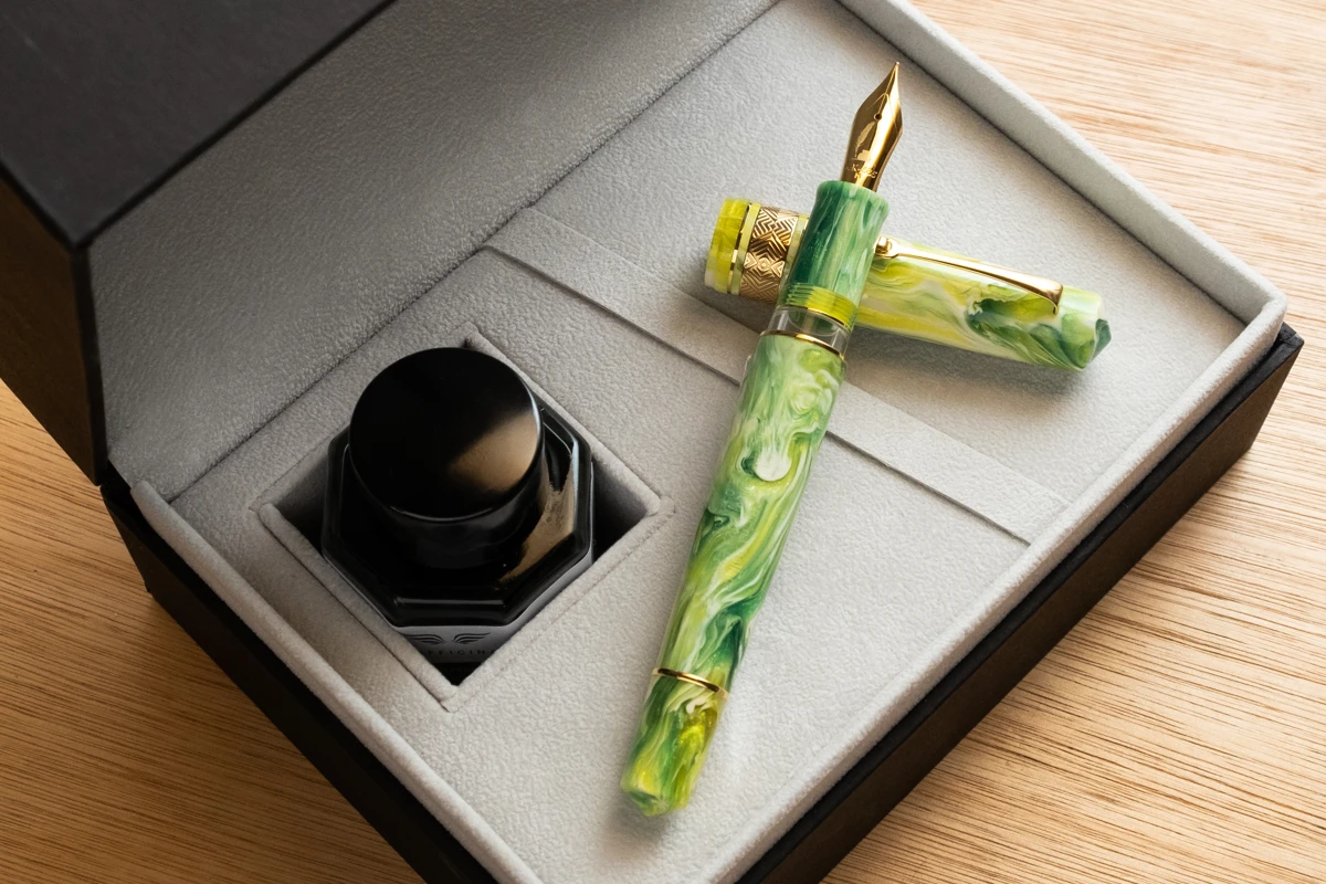 Het materiaal werd vervolgens naar Leonardo gestuurd, waar ze er prachtige pennen van hebben gemaakt. Voor het eerst dit jaar zal de pen verkrijgbaar zijn in 3 verschillende uitvoeringen: goud, zilver en ruthenium.