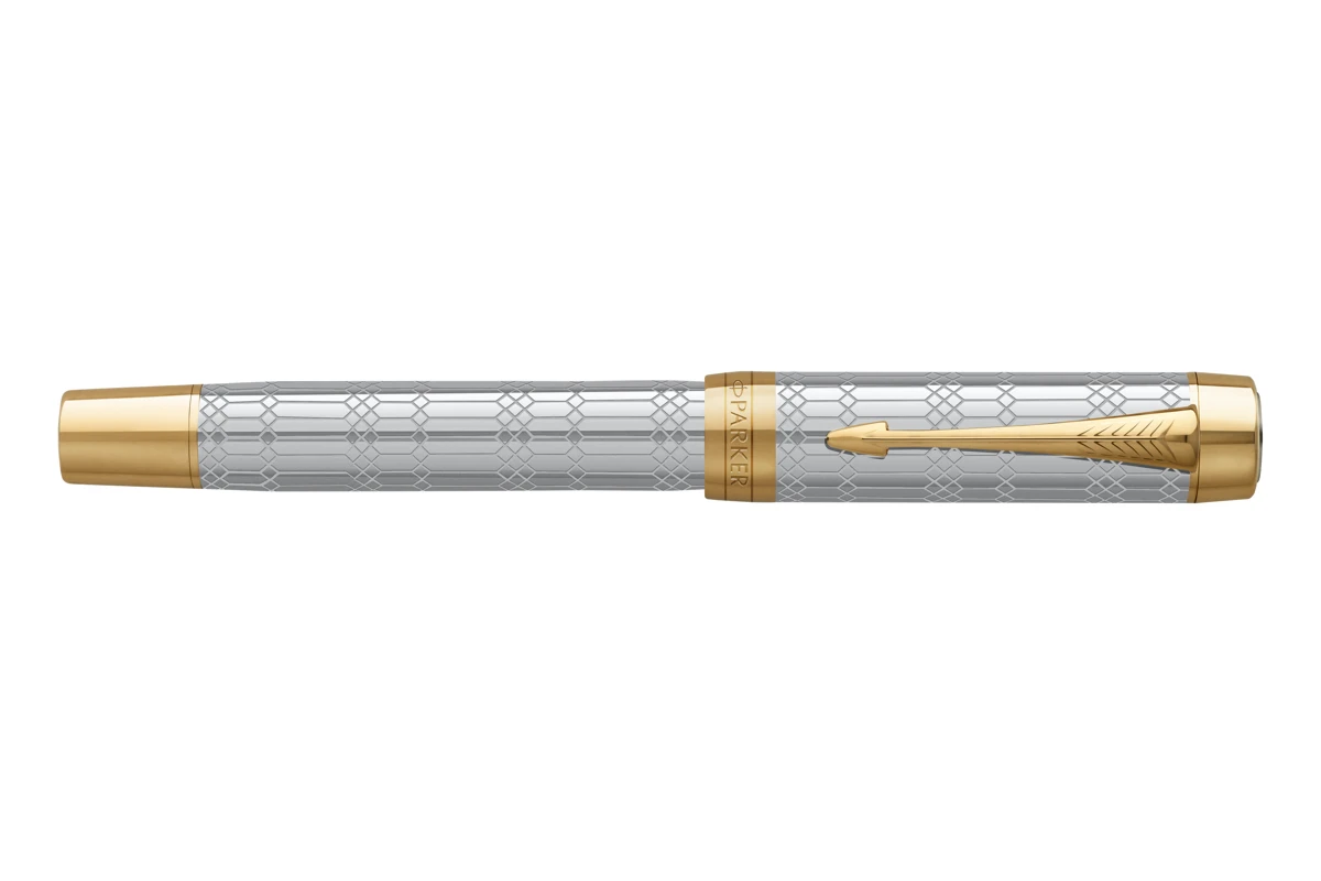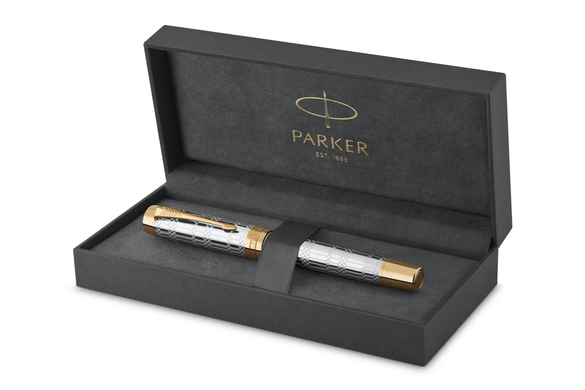 De Parker Duofold Queen’s Platinum Jubilee is gemaakt van massief palladium gecoat 925 en het ontwerp van de dop en de barrel is gegraveerd om een geweven textuur te creëren, wat een uitgesproken koninklijke uitstraling geeft. De pen bevat de kenmerkende Duofold penpunt van 18kt tweekleurig massief goud en rhodium plating.
