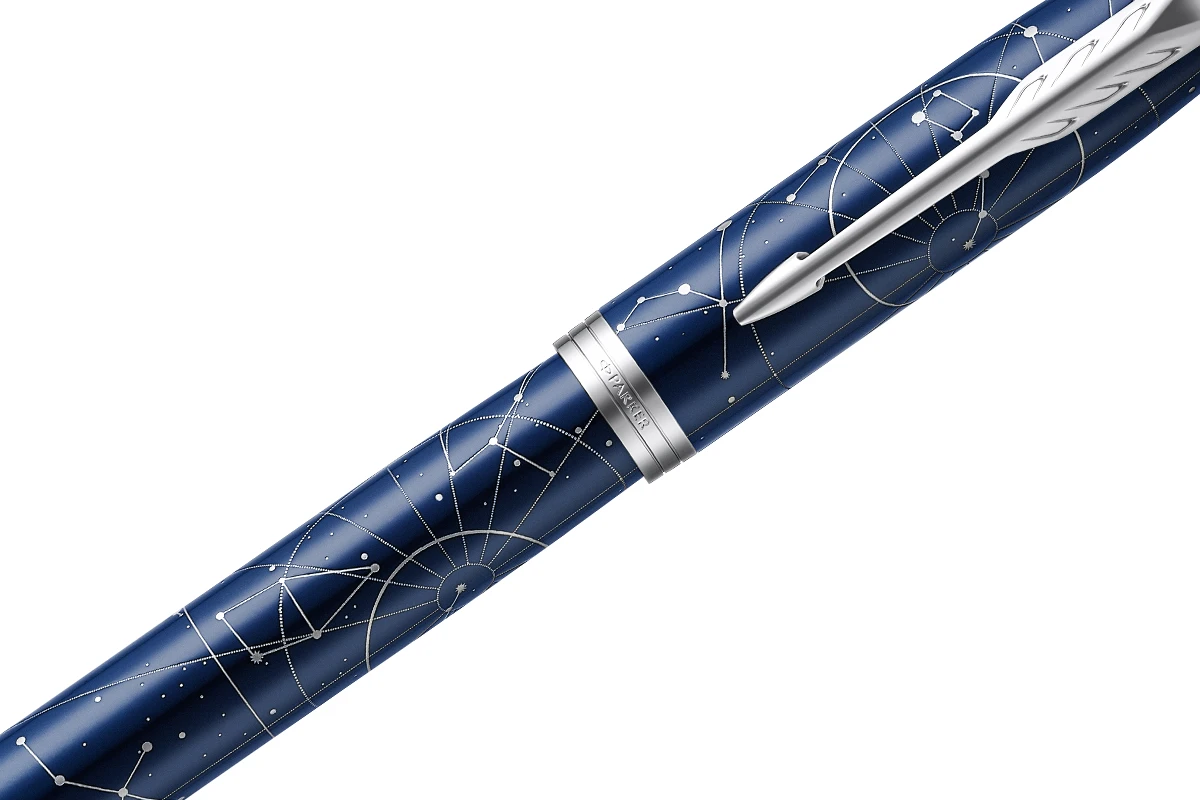 De IM Special Edition Midnight Astral is geïnspireerd door het universum in de palm van ons hand. De dop en barrel, verfraaid met een sterrenbeeldconstellatie, begeleiden ons op onze reis naar het creëren van een positieve impact op de wereld. Het soort impact dat de hele nacht door schijnt en ons doel in het leven viert. Met een roestvrijstalen, blauw gelakte houder en dop met een glanzende vernis en de iconische pijlclip, is deze pen zorgvuldig afgewerkt volgens de hoge standaard emblematische of Parker’s expertise en vakmanschap. Met de Parker IM Special Edition Midnight Astral kunt u uw doel vinden.