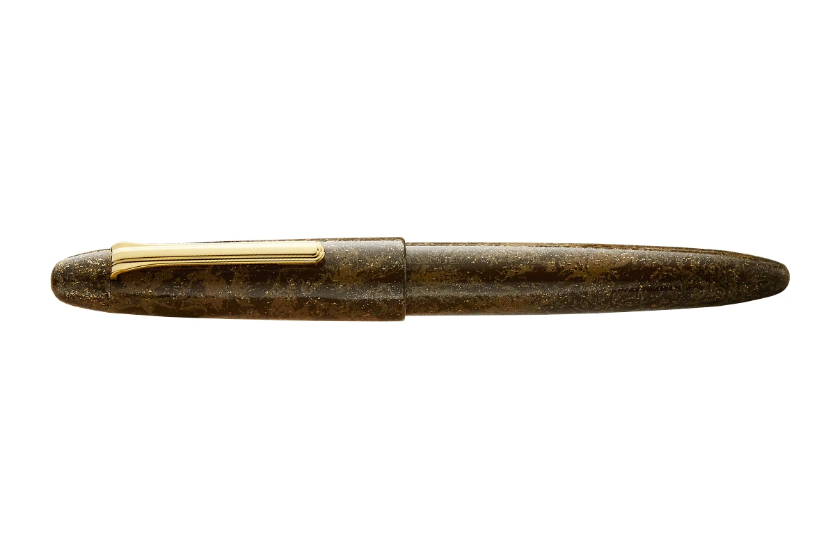De vulpen is voorzien van een gerhodineerde, tweekleurige, 21-karaats gouden penpunt. De pen is verkrijgbaar in onze winkel en webshop met een brede penpunt. De pen wordt geleverd in een paulowina doos, die uitermate geschikt is voor het bewaren van lakproducten. De doos wordt gecomplimenteerd door de toevoeging van een Sanada-lint dat vaak gebruikt wordt bij Japanse theeceremonies.