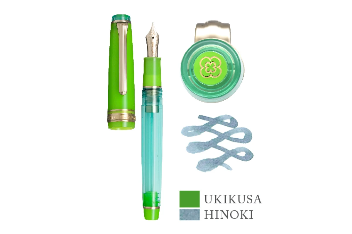 De Sailor Pro Gear Slim Manyo II ‘Grass’ vulpen bestaat uit de kleurencombinatie van Sailor Manyo ‘Ukikusa’ en ‘Hinoki’, en wordt geleverd met een flesje ‘Hinoki’ Dual Shading inkt.
