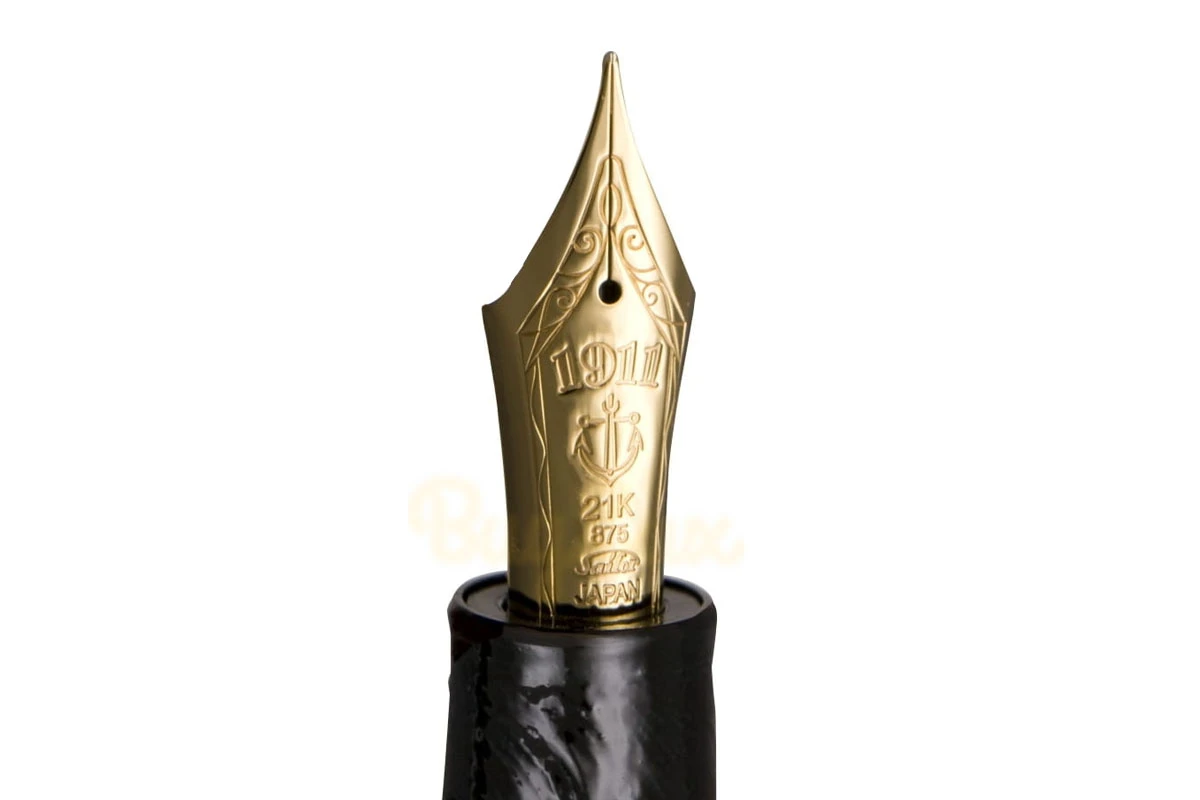 De pen wordt geleverd in een mooie houten kist met converter, inktpatronen, stofdoek en certificaat. De pen heeft een grote 21kt gouden penpunt, verkrijgbaar in de maten Medium of Broad.