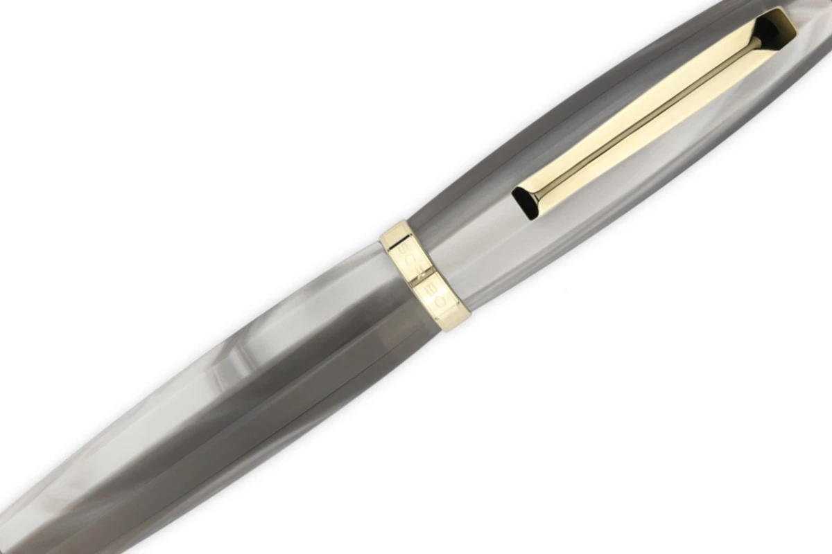 Een verfijnde lichtgele gouden rand geeft licht en benadrukt de Feel Grigio Giorno tinten. Met slechts 219 handgemaakte exemplaren accentueert Grigio Giorno de slanke vorm van de Feel en onderscheidt zich marmoreel voor een nieuw handschriftgenot.