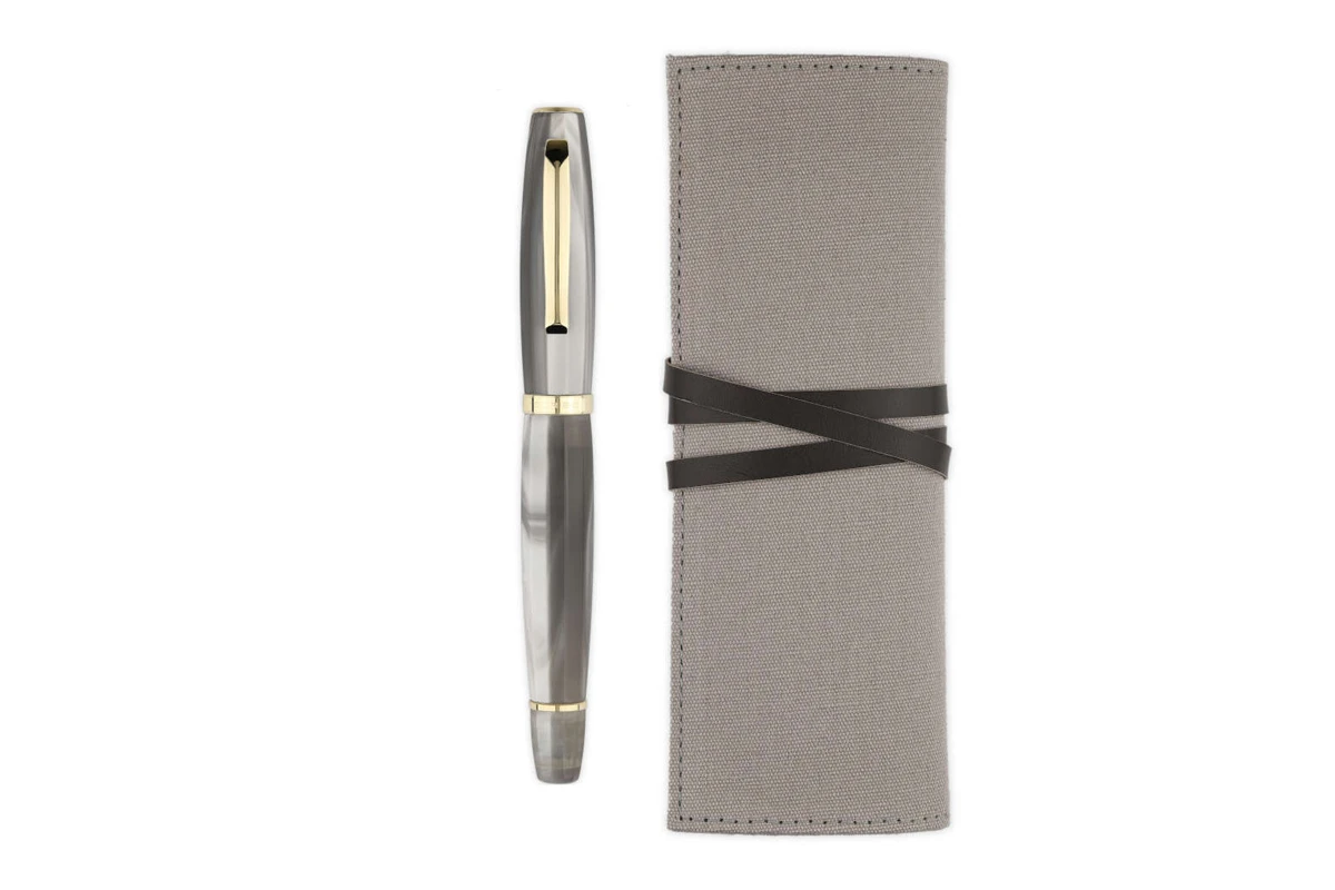 Feel Grigio Giorno gaat ook vergezeld van een echt handgemaakt etui van leer en katoen, gemaakt om twee kostbare schrijfinstrumenten te beschermen. In het zijvakje vindt u een doekje om uw vulpen schoon te houden. Een kostbare en moderne verpakking waarmee u uw favoriete schrijfinstrumenten overal mee naartoe kunt nemen.