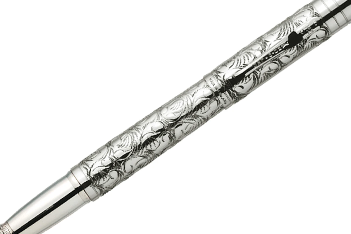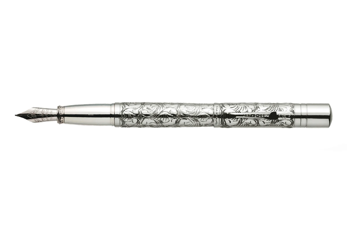 Het Britse merk Yard O Led bestaat sinds 1934 en staat bekend om haar verfijnde, handgemaakte schrijfinstrumenten van massief zilver. Deze zwaar gegraveerde vulpen heeft een klassiek ontwerp.